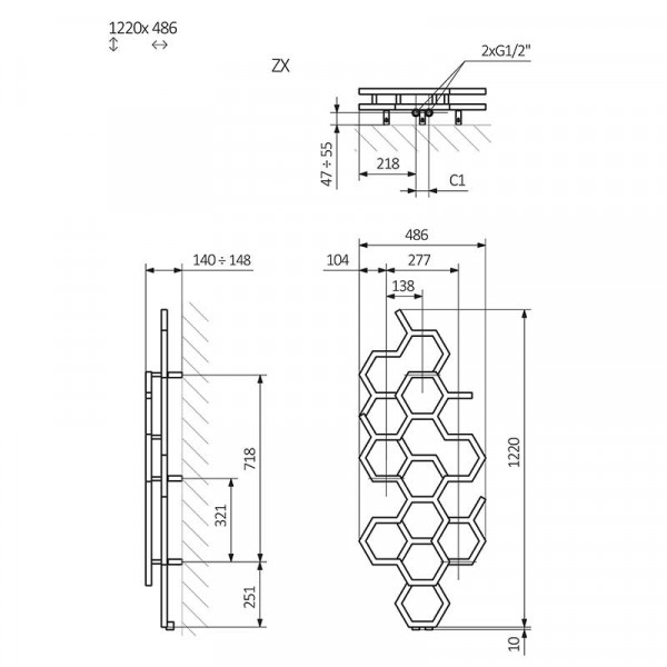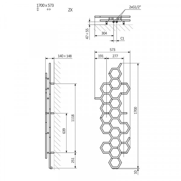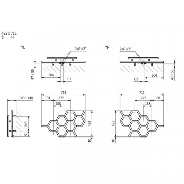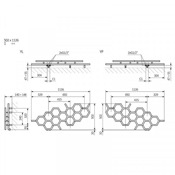 Grzejnik Hex podłączany jest jedynie od dołu od lewej YL albo prawej YP strony dla wysokości 422 i 502, dla wysokości 821, 1220 i 1700 dostępne jest jedynie podłączenie dolne środkowe ZX.